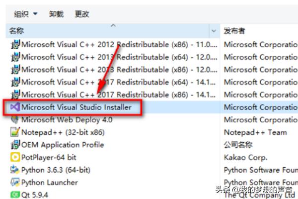 3、这个就是我们熟悉的win7的卸载功能了我们看到vs 2017安装了许多的插件等等程序我们不用点击其它的程序visual studio installer这个是使用官方的程序卸载
