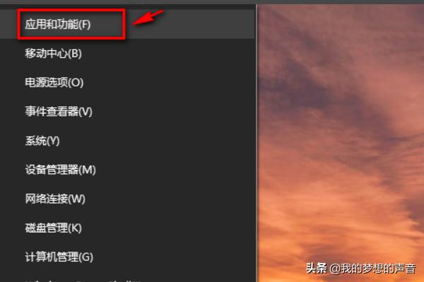 1、在桌面右键点击“win”键,选择“应用和功能”。